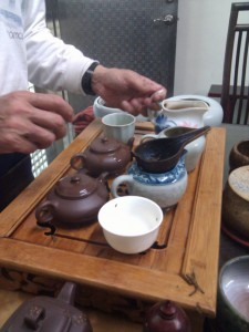 9-11: Older puerhs (2001, 1994, 1988 in succession). The 2001 tiebing puerh, wild tree, from a mountain (near yiwu) I didn’t get the name of. Smooth and bitter (in a good way). It was a nice break from the younger puerhs we’d been having. The biggest improvement was in the mouthfeel rather than the taste (full and thick, whereas the younger stuff had been closer to water).