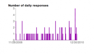 First, here’s a plot of how many books I’ve entered data for per date. You can see I was pretty good about entering data promptly in 2009, while in 2010 I got a bit lazy and didn’t enter data until I had multiple books to add at once. I wish there was a more automatic way to track this data and enter it automatically, especially now that I’m using an ebook reader (Sony Ereader).